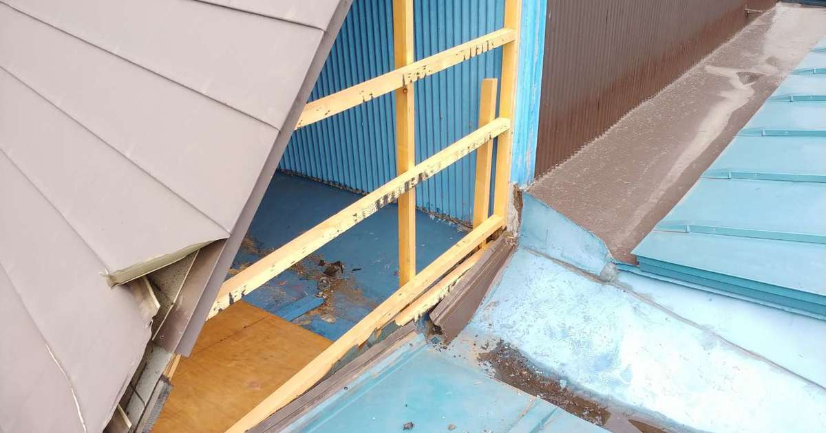 店舗が並ぶ屋根、複雑な形と隣同士屋根がくついていて補修が難しい。雨の量が多い時だけ漏れるらしく、場所を特定する為に天井に点検口を付けて調べました。
