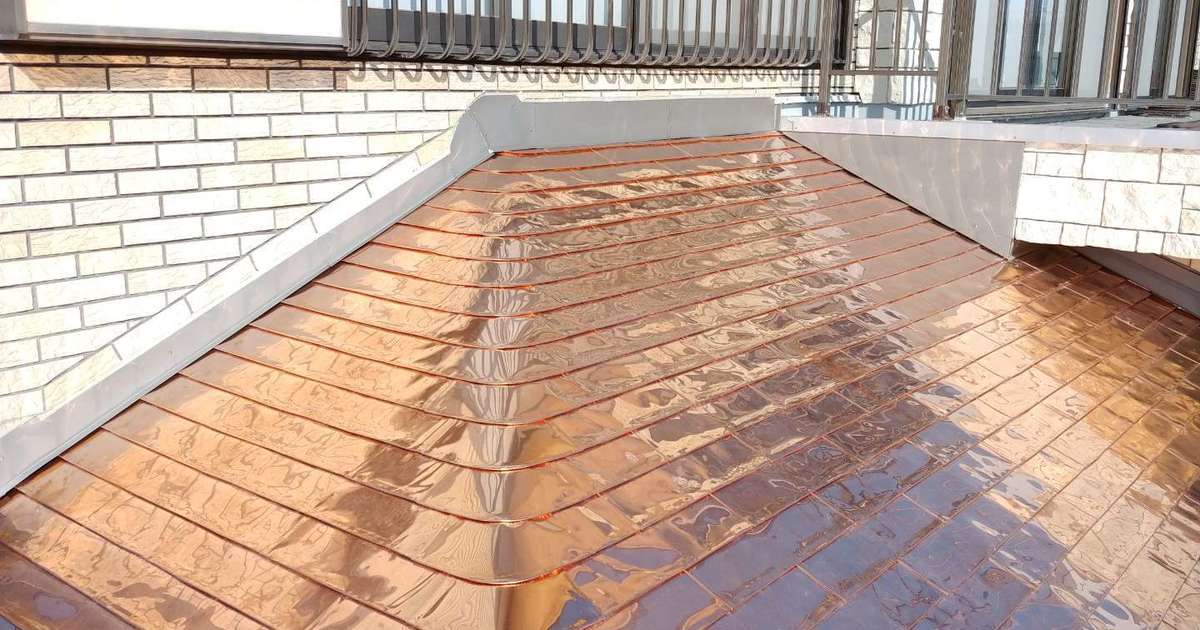 壁際の雨仕舞いに、カラーステンレスを使って施工。気温が20度以上になり銅板の照り返しで暑かった。