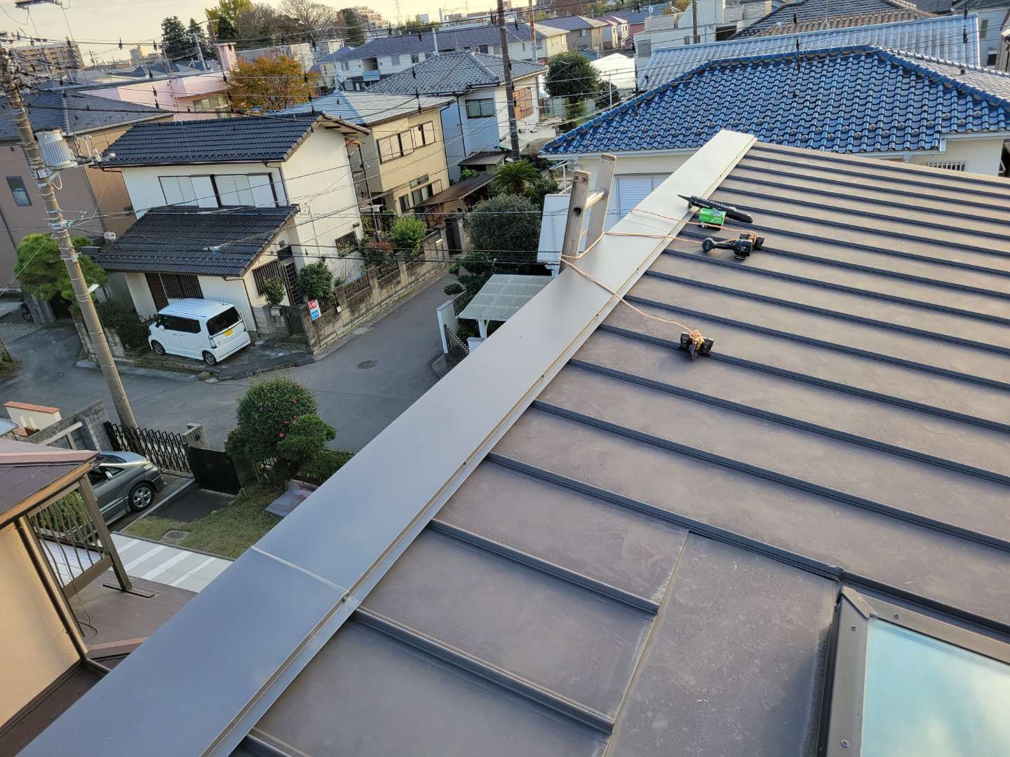 片棟からの雨漏り工事、屋根材の立ち上がりと片棟の重なりが少ないのと、面戸が取り付けていない、更に片棟の重なり部分にアザ折りがなかったのが原因で雨漏りしてました。防水と硬質プラスチック木材、面戸、片棟を幅広く加工して対処しました。