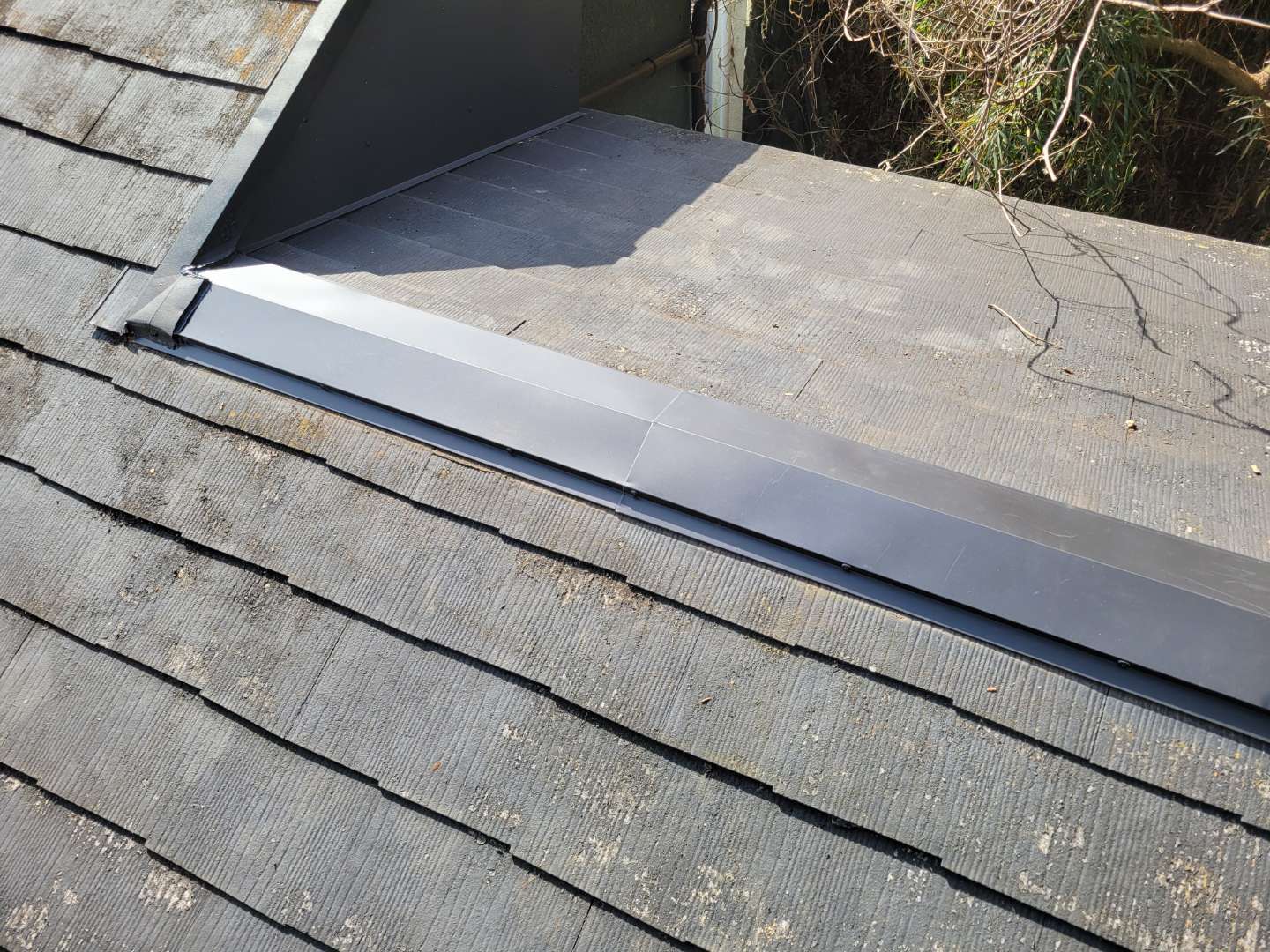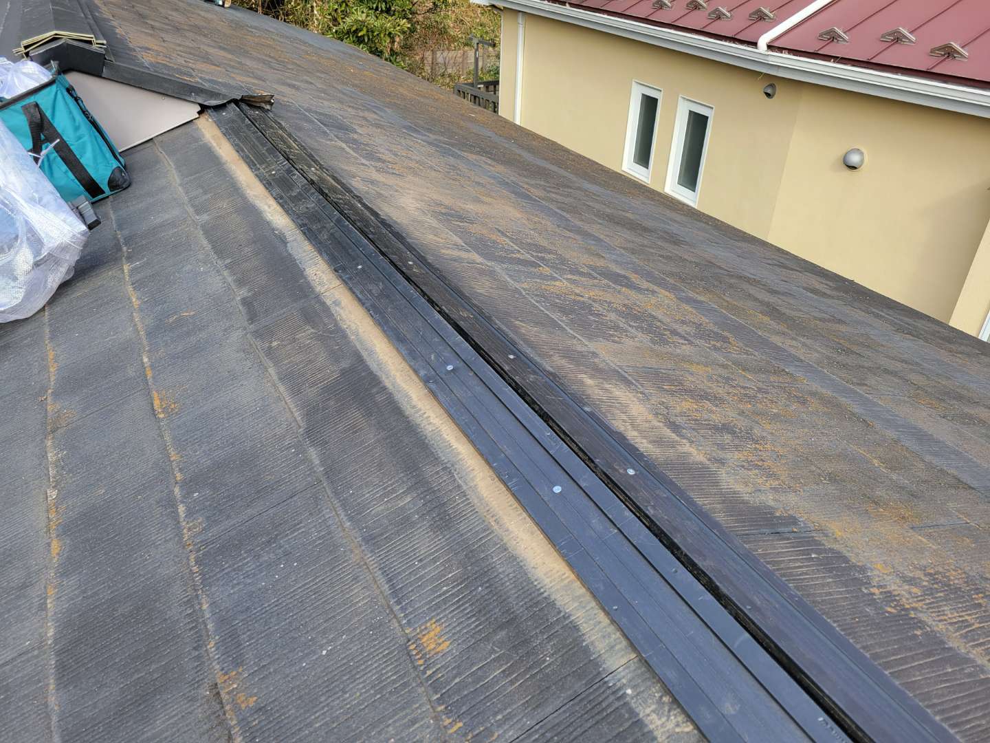 強風の為、カラーベスト屋根の棟の部分が飛ばされました。台風の時期にも多いですが意外と冬の季節風や春にも強風で被害に遭う事があります。