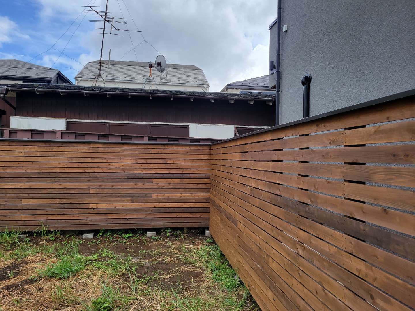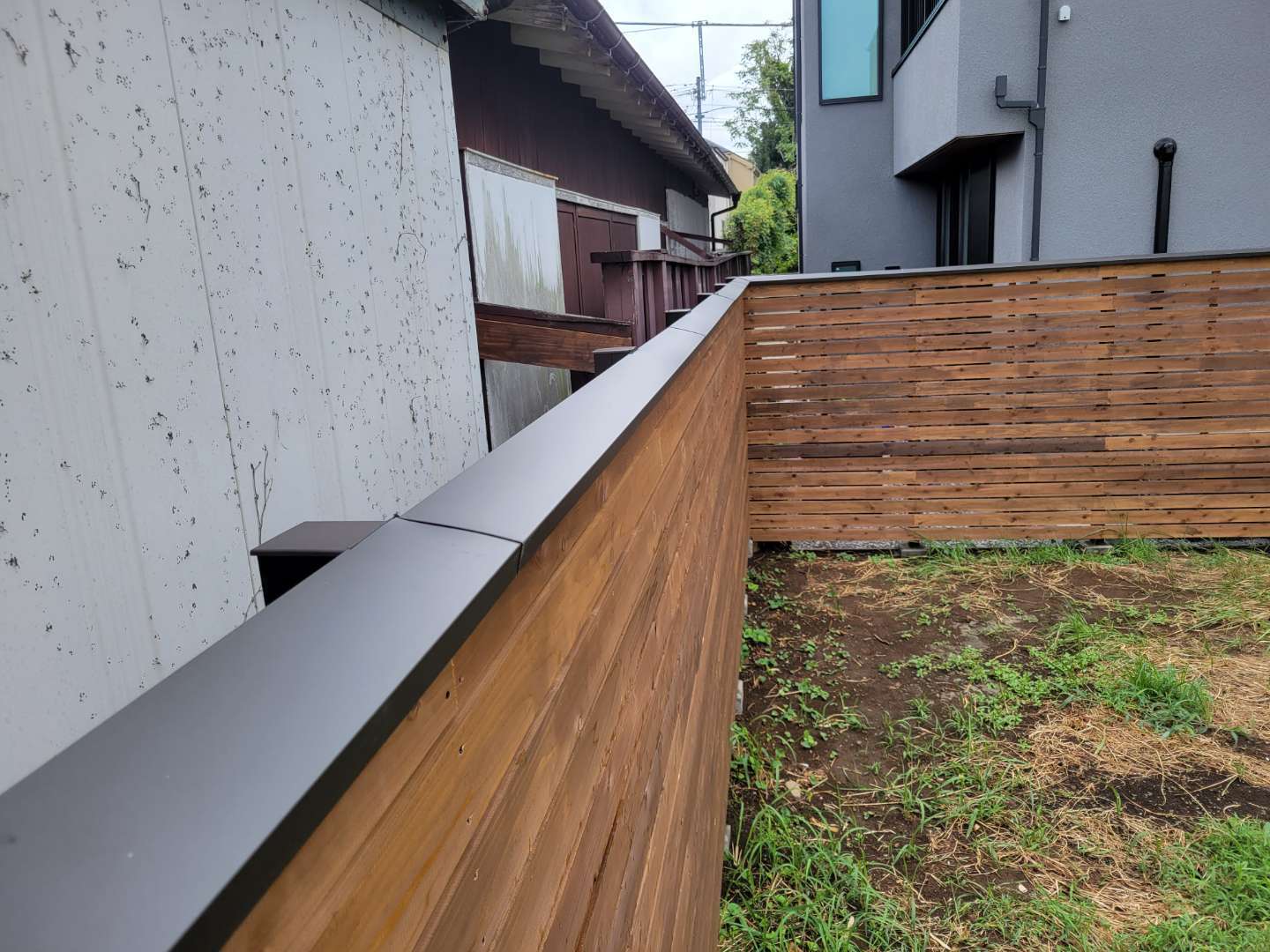 建物の新築工事は完了して、敷地境界に塀が作られ、笠木を板金で、納めました。