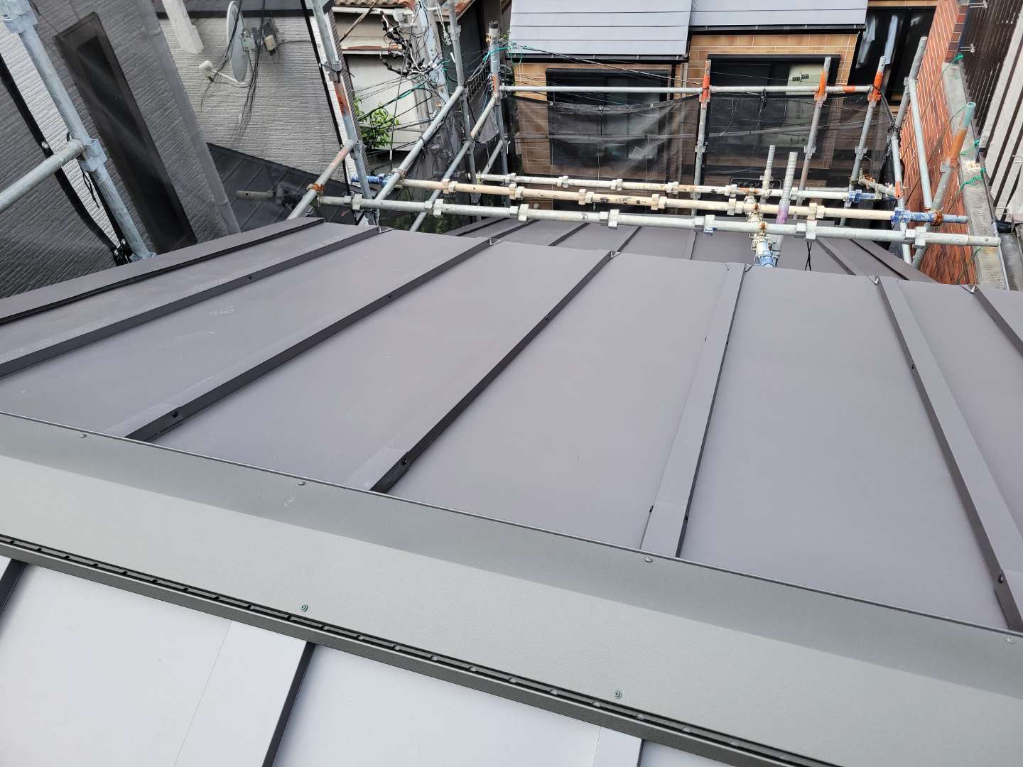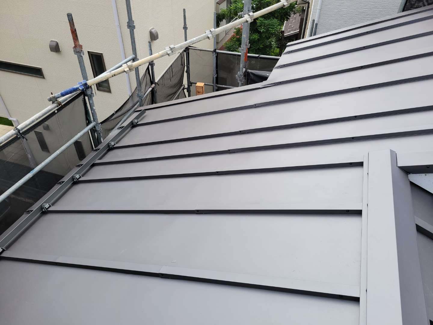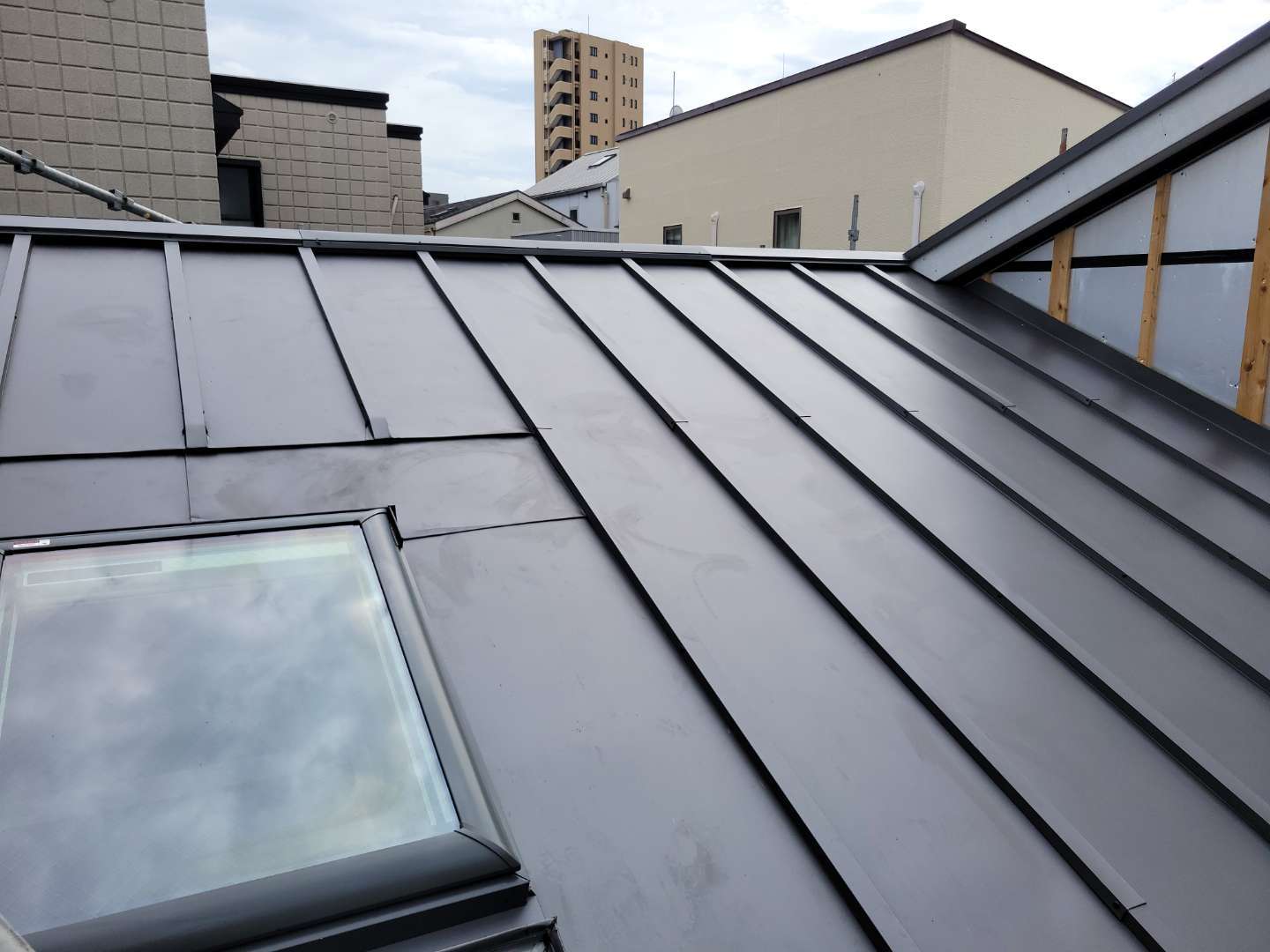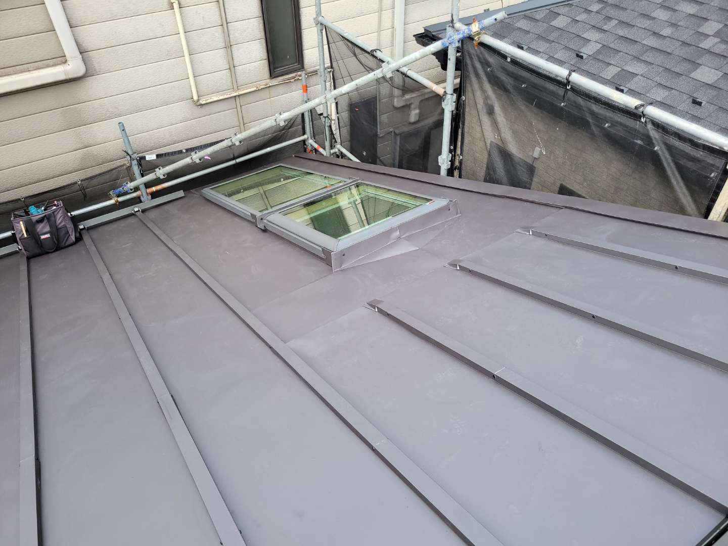やっと屋根が完了、一番最後にトップライト回り雨仕舞の施工を残してました。