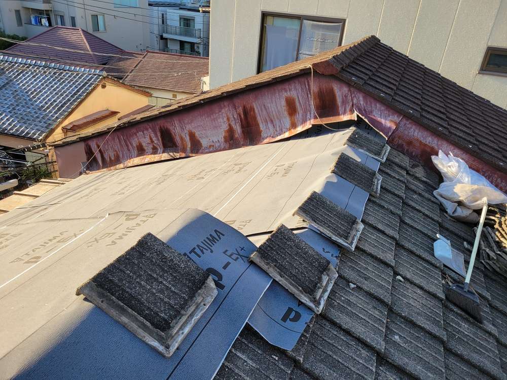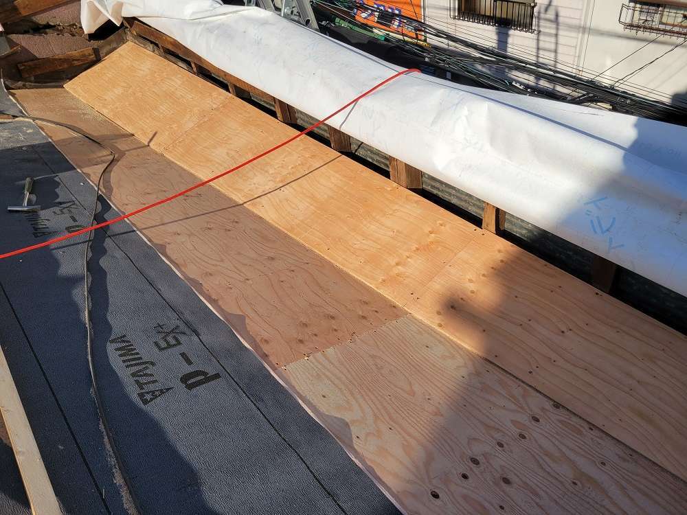 パラペット裏の谷も雨水が、投げれやすくする為に新しく勾配を付けて下地を作ります。