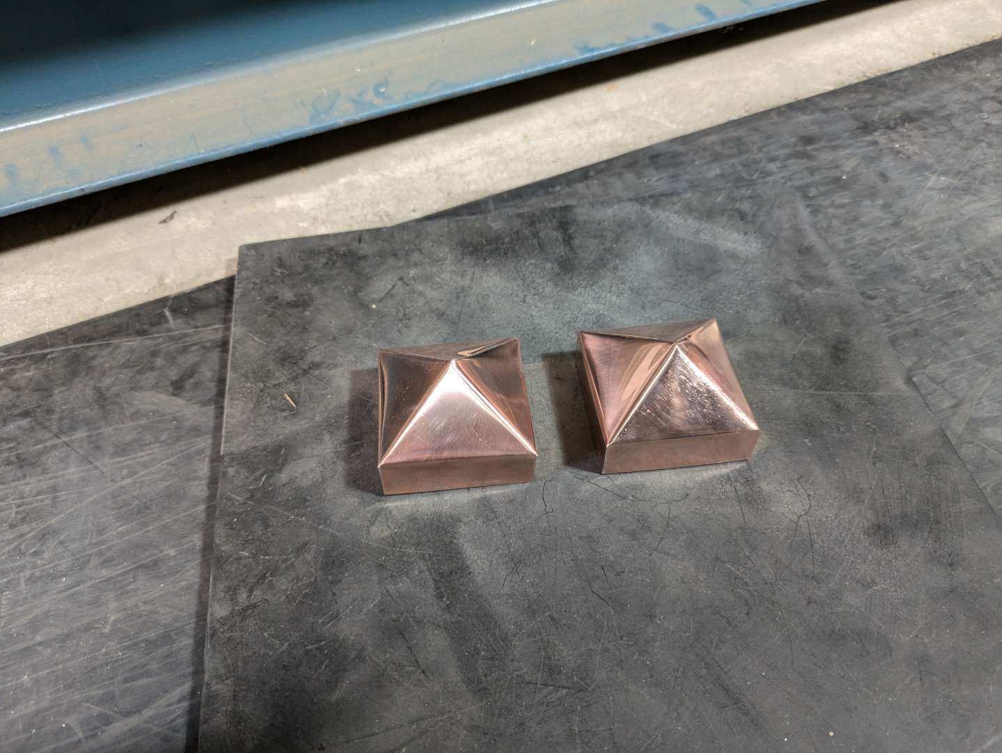 車止め柱キャップを銅板で作成。去年、2級板金技能士に合格したスタッフに作らせました。展開図を描いたりとした作業では。技能士の資格がこういった所に活かされます。