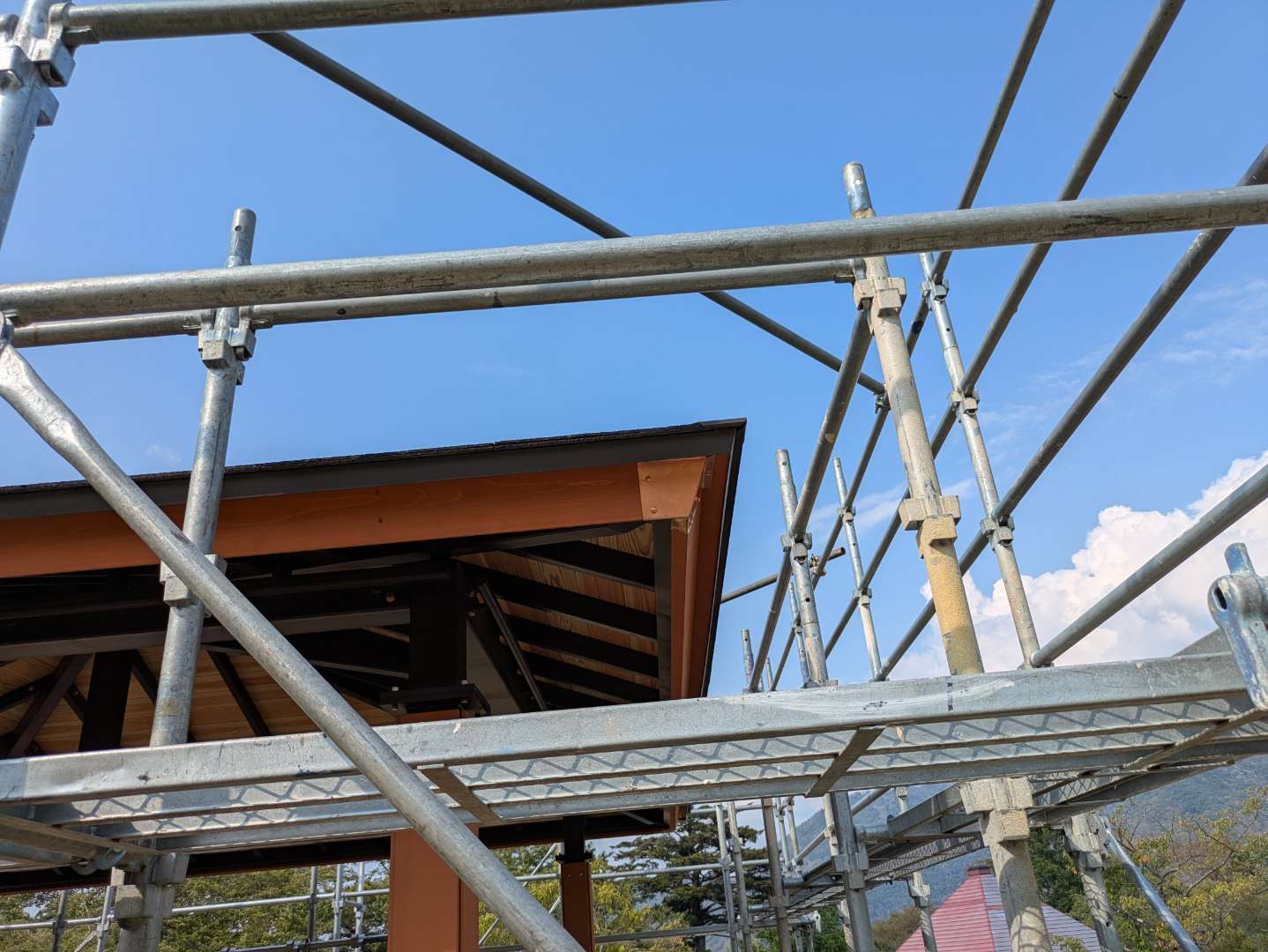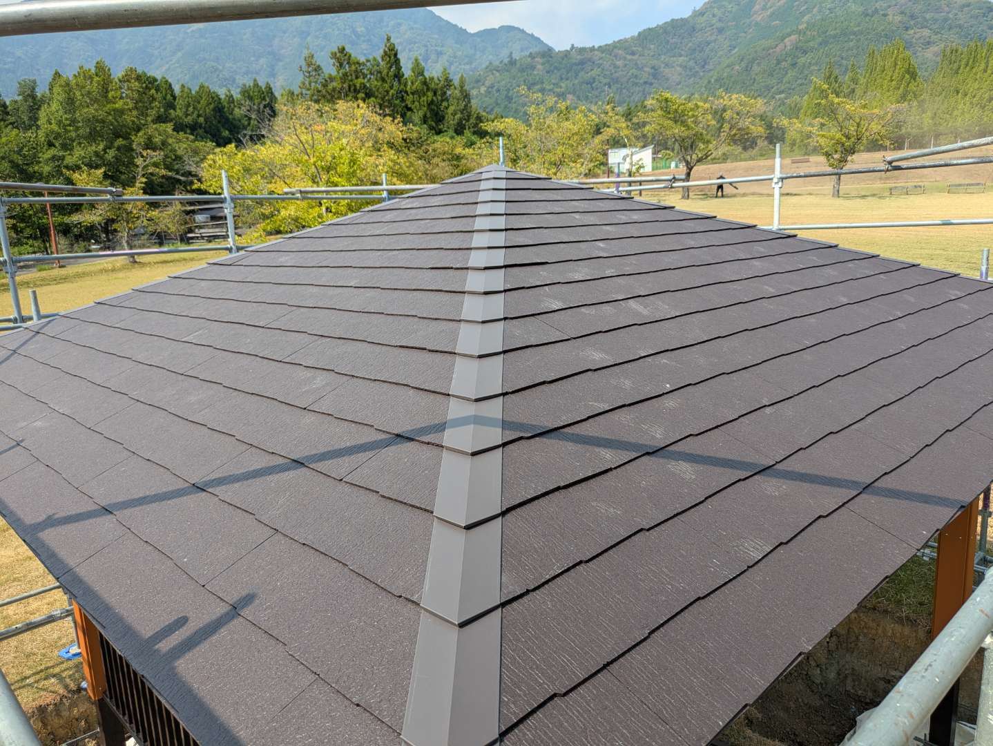 猛暑の中、富士クラフトパーク内の四阿屋根工事に出張で来ました。