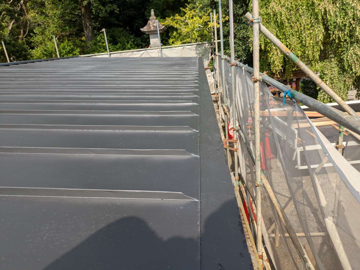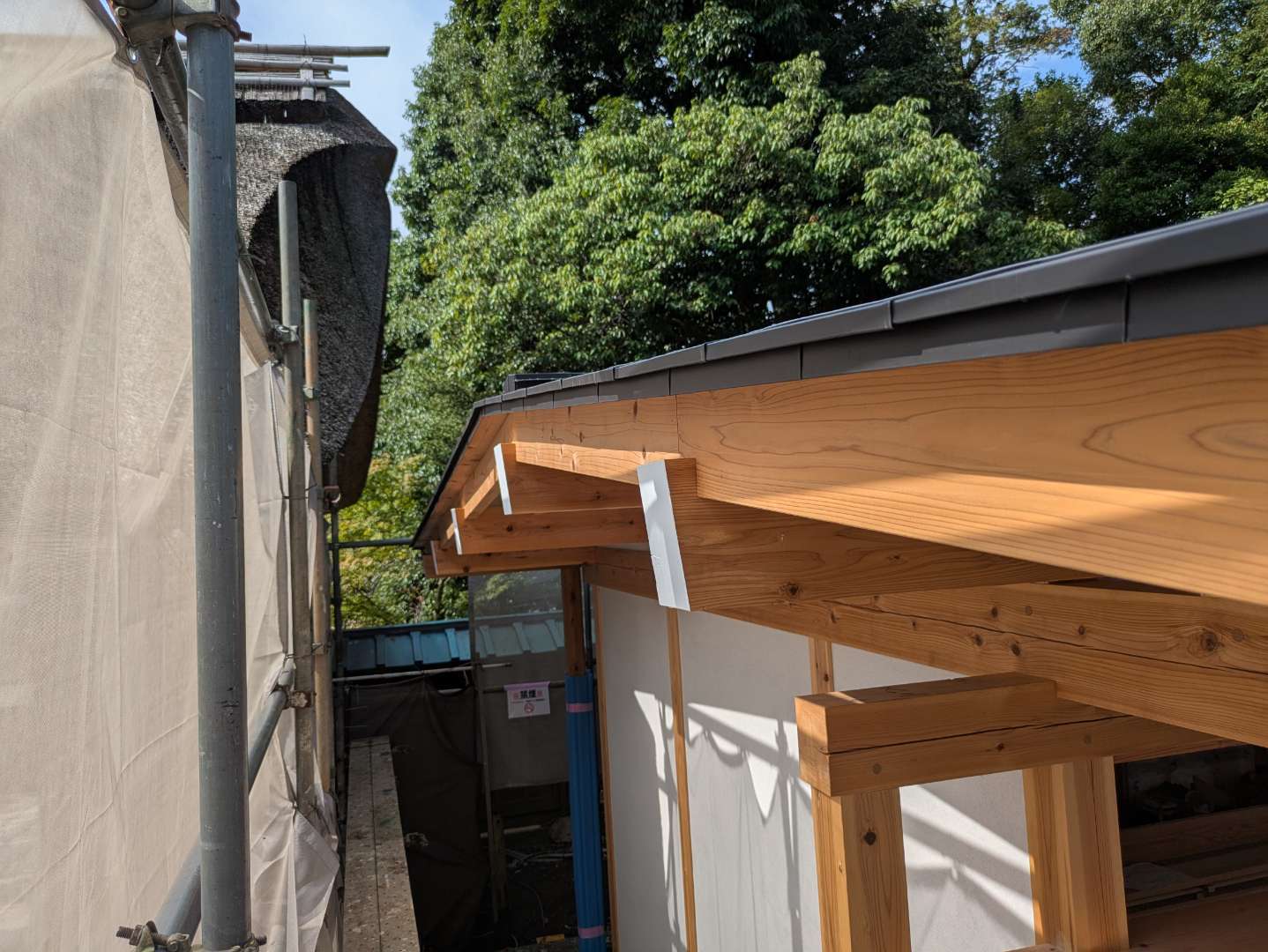 足場が外れたらまた画像をアップしたいと思います。まだ柱の根巻き(銅板)と沓摺(ステンレス)が、この後続く予定です。