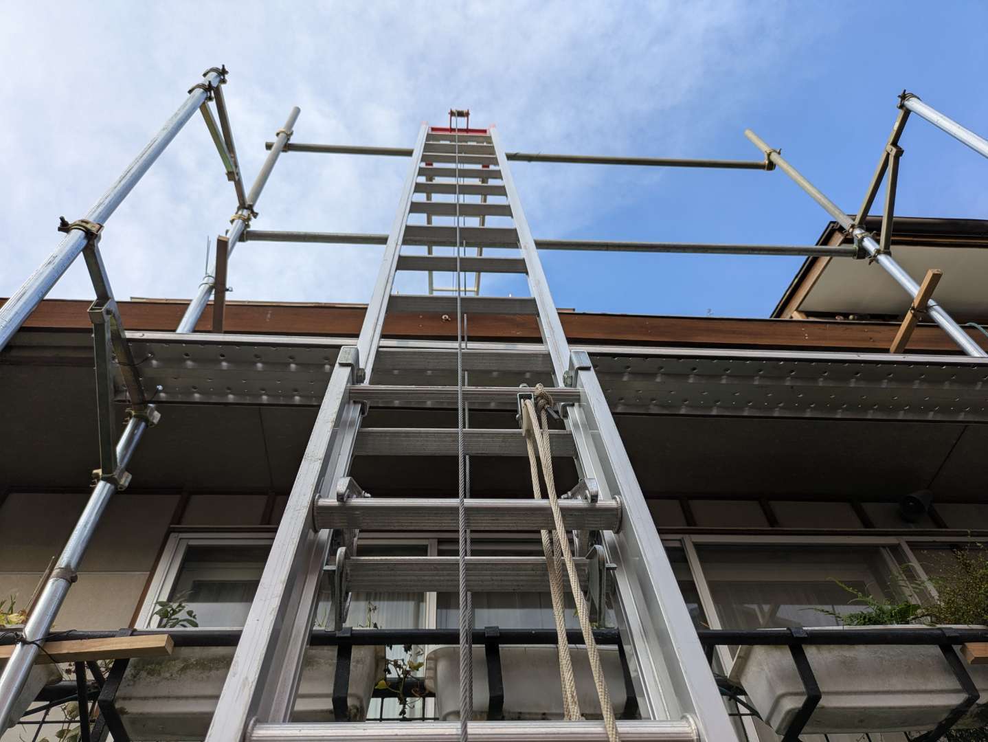 3階の屋根改修工事、材料等荷揚げの為に足場を組んで屋根揚機をセット。
