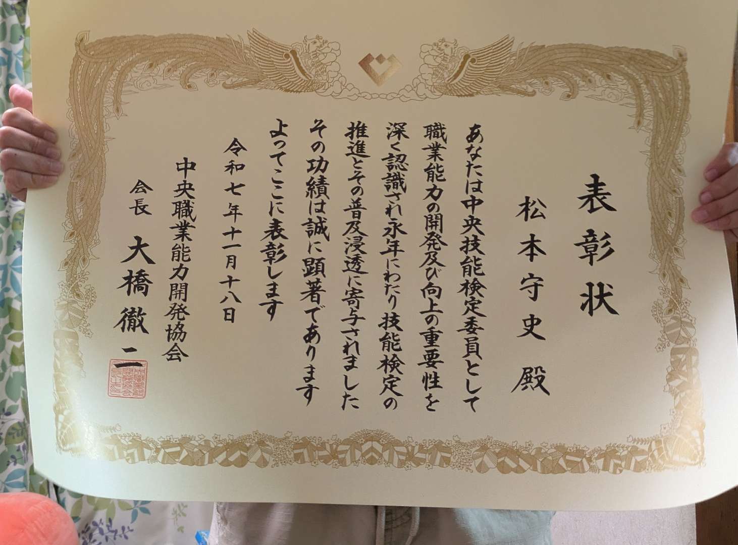 長年に渡り、技能検定に携わる事となり今回、功労賞を受賞しました。
