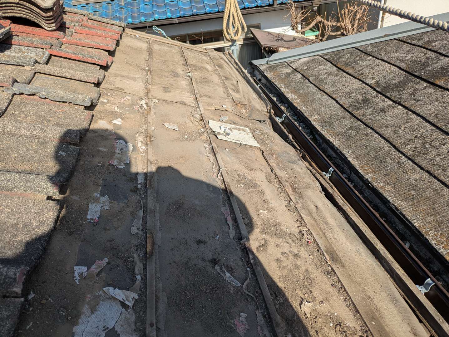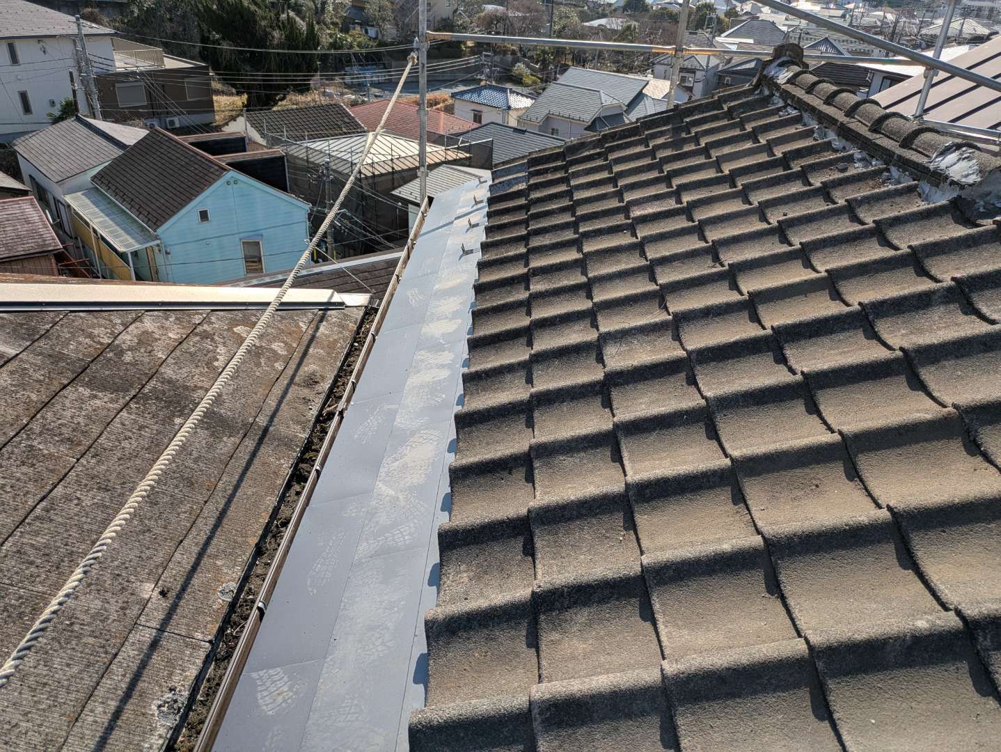セメント瓦の補修工事です。予算の関係で葺き替えから部分補修となりました。雨樋を全部交換したのですが瓦の軒先部分が雨樋の位置と合わないので軒先部分だけ葺き替えました。