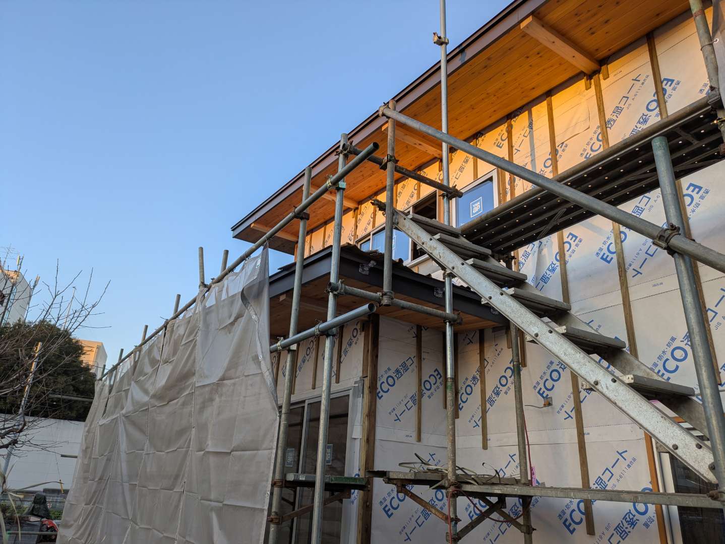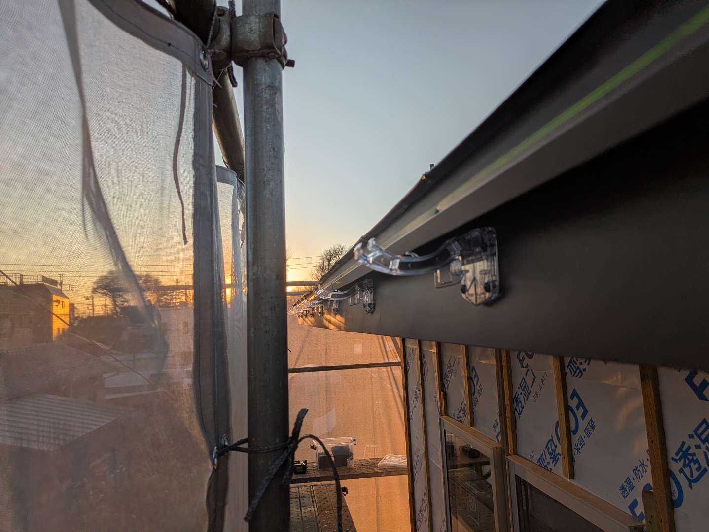 少し鼻隠し・破風の板金工事が残りましたが、左官屋さんが何時でも入れる様に絡みの所は完了。