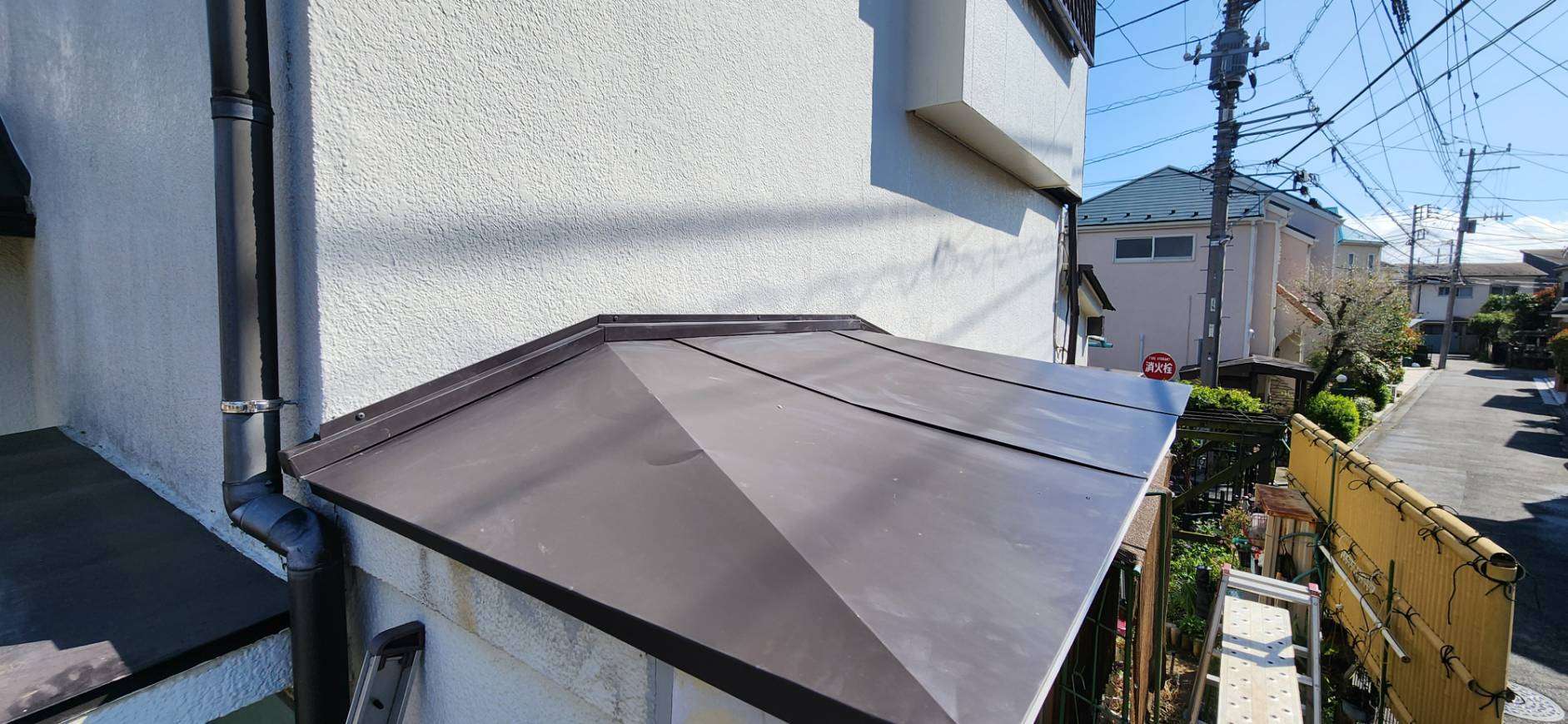 玄関屋根の改修工事、勾配が緩く既存の屋根は横に繋いでいた為に雨水が入って軒先が腐食していました。勾配によっては立てハゼで繋いだり、立て方向に繋ぐ事で雨仕舞いしたほうがいいと思います。