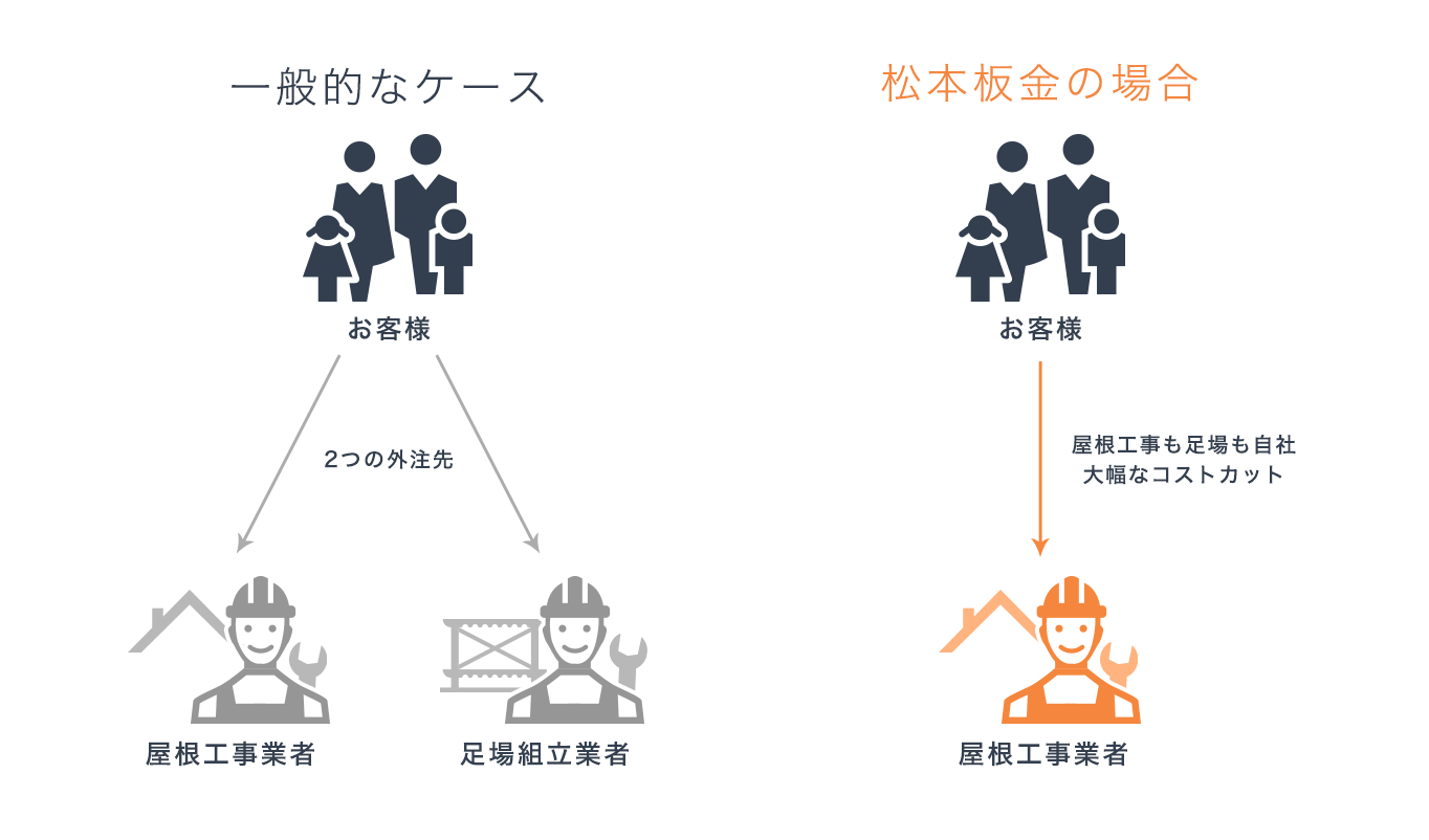 屋根工事で必ず必要となる足場は、足場の専門業者に依頼するのが一般的ですが、松本板金は自社にて足場を構築できる技術力と資材を備えております。別途ご依頼いただく際のコストを削減できるのはもちろん、足場の信頼性にも自信がございますので、安心してお任せいただければ幸いです。まずはお気軽にご相談を。